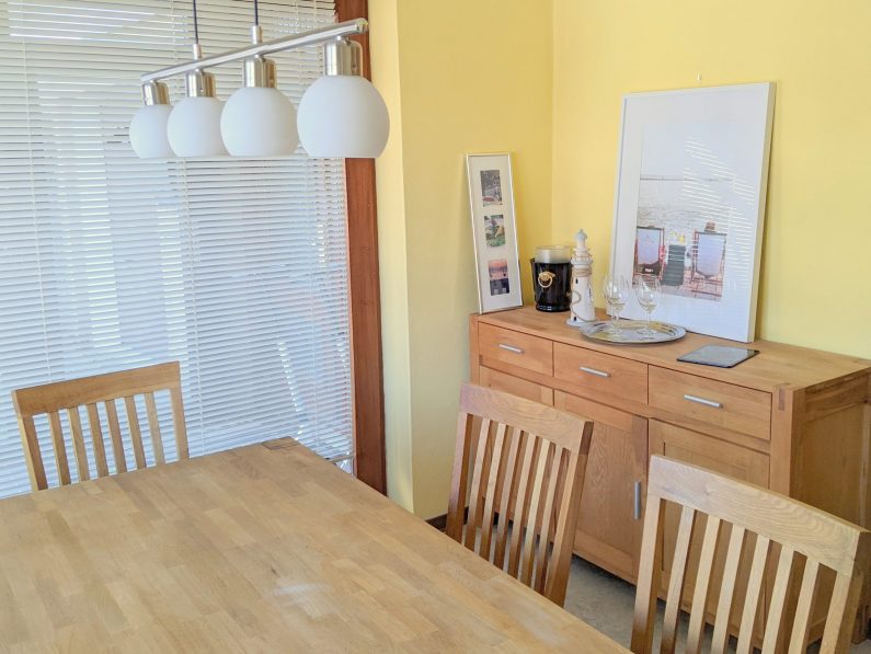 Im Erdgeschoss gibt es eine geräumige Küche (Herd mit Backofen, Geschirrspüler, Kaffeemaschine, Pad-Maschine für Espresso, Toaster, Wasserkocher und Mikrowelle). Daneben befindet sich das Esszimmer und auf der anderen Seite des Flurs das Wohnzimmer mit Zugang zur Südterrasse im Garten. Im Wohnzimmer finden Sie einen Flachbildfernseher.