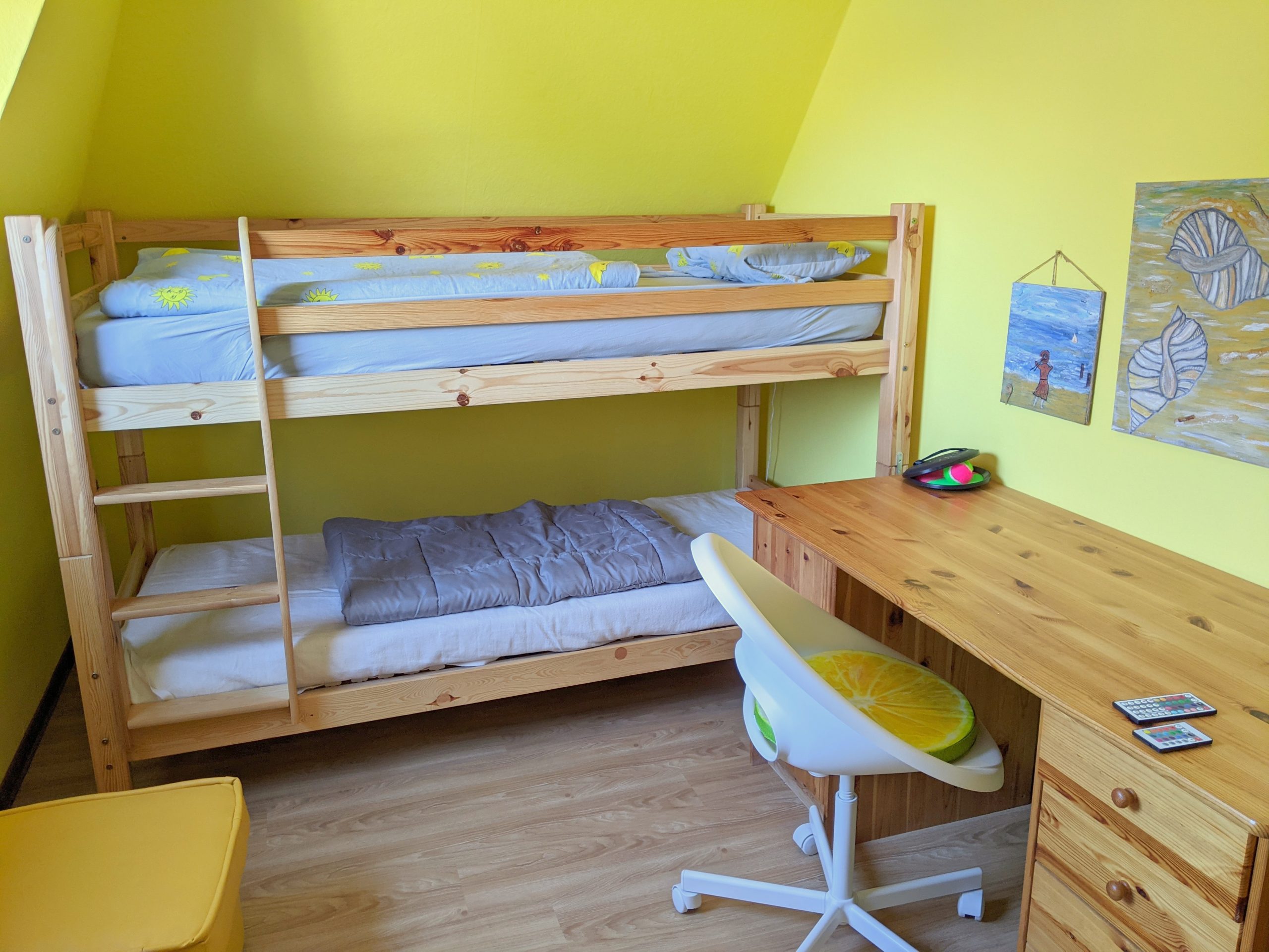 Das Haus verfügt über ca. 110 qm Wohnfläche und ist für zwei bis sechs Personen geeignet. Insbesondere Paare, die gern getrennt schlafen möchten, können sich auf zwei Schlafzimmer verteilen. Ein dritter Schlafraum ist das Kinderzimmer mit Stockbett und Schreibtisch. Diese Räume und das Bad befinden sich im OG.